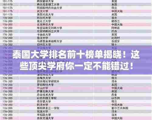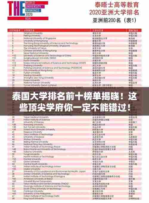 泰国作为东南亚的重要国家,其教育体系和教育质量逐渐受到国际关注,随着全球化和教育国际化的趋势不断加强,泰国的大学教育也在不断发展,本文将介绍泰国排名前十名的大学,这些大学在学术水平、科研能力、国际化程度等方面均表现出色。