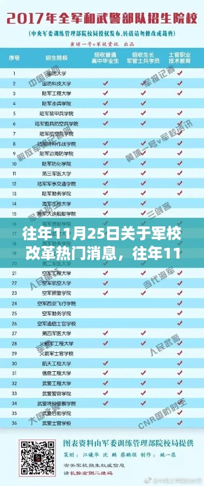 随着时代的发展,军事领域的变革也日新月异,每年的军校改革消息总能引起社会的广泛关注,特别是在往年11月25日,关于军校改革的热门消息层出不穷,这些消息涉及军校教育体制、训练模式、科技融合等多个方面,本文将围绕这些改革消息,阐述个人的一些观点。